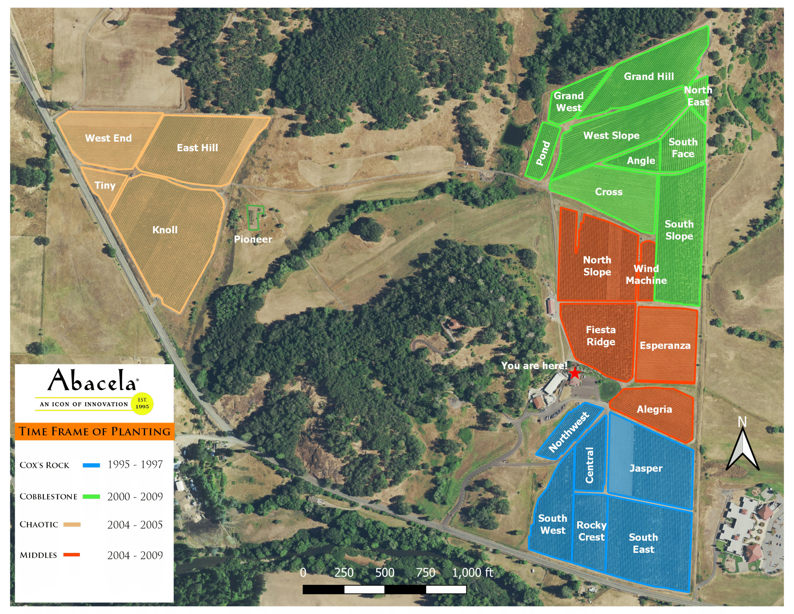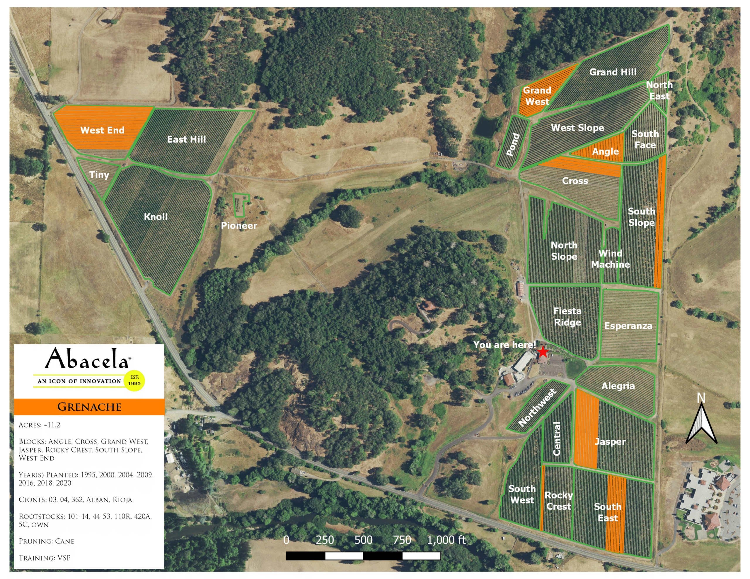 Maps of all varieties planted at Abacela available upon request.