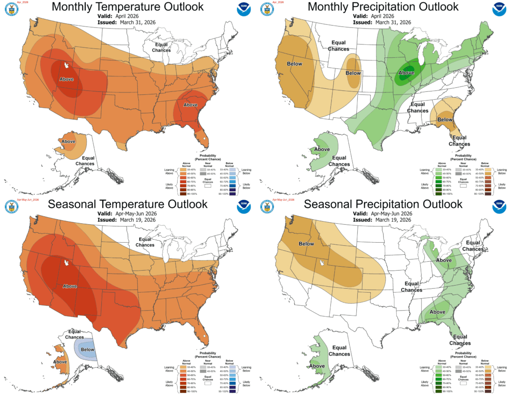 Figure 7 – Temperature (left panel) and precipitation (right panel) outlooks for the month of April (top panel) and April, May, and June (bottom panel) (Climate Prediction Center, climate.gov).