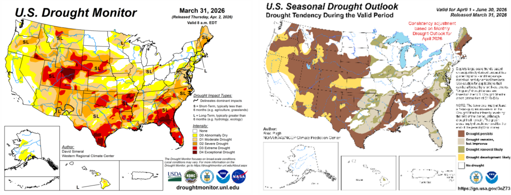 Figure 3 – Current US Drought Monitor and seasonal drought outlook.