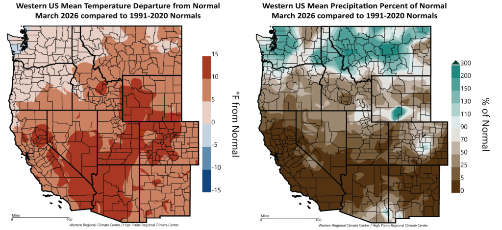 Figure 1 – Western US March 2026 temperature departure from normal (left) and percent of normal precipitation (right; images from WestWide Drought Tracker, Western Region Climate Center; University of Idaho).