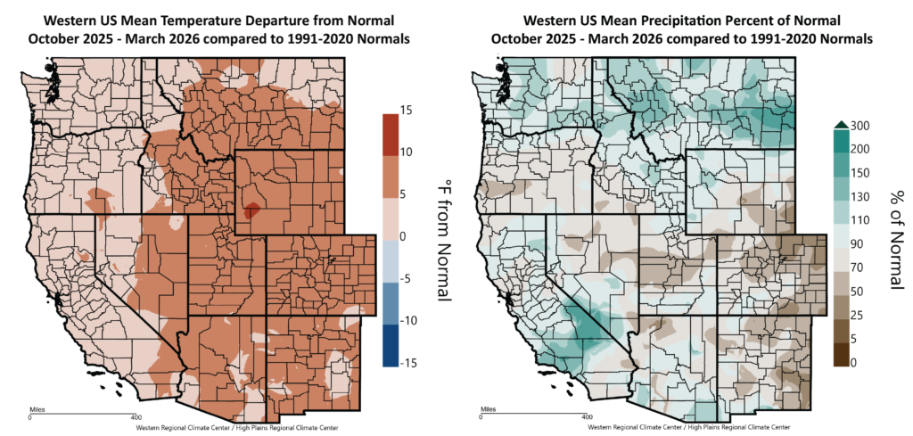 Figure 2 – Western US water year (October 2025 through March 2026) temperature departure from normal (left) and percent of normal precipitation (right; images from WestWide Drought Tracker, Western Region Climate Center; University of Idaho).