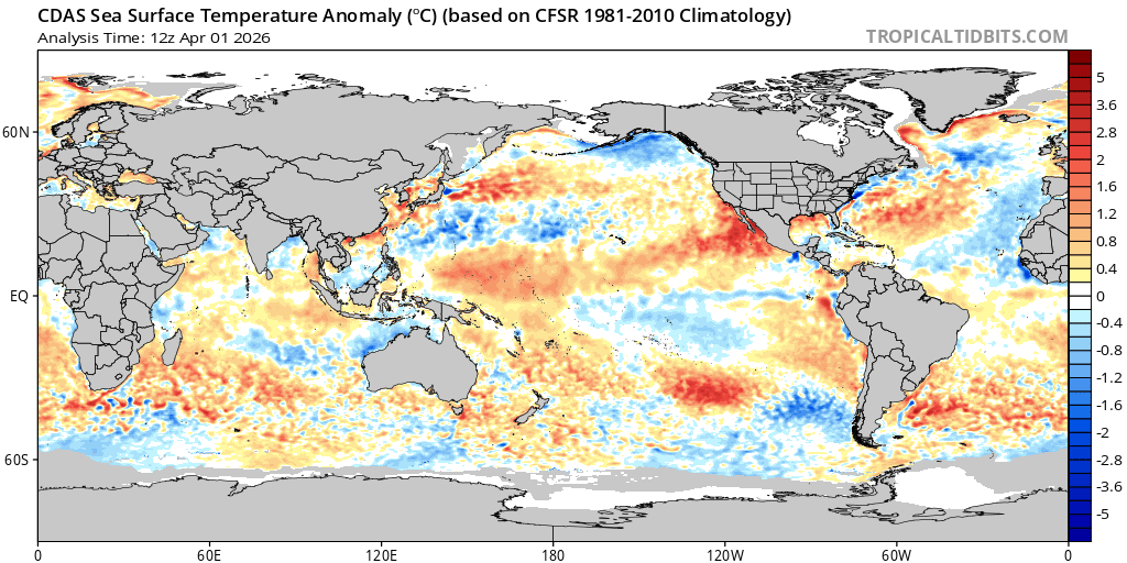Figure 4 – Global sea surface temperatures (°C) for the period ending April 1, 2026 (image from Tropicaltibits.com).
